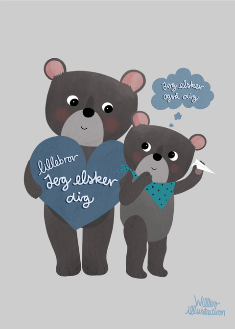 Willero Illustration kreerer håndtegnede eventyr til børn og barnlige sjæle. Stilen spænder fra det meget farverige med rene, skarpe linjer, til det mere minimalistiske - ofte i afdæmpede farver. Bag Willero Illustration står tegner og illustrator, Petrine Willero, der er medlem af “Tegnerforbundet af 1919” og udover at tegne plakater, blandt andet også illustrerer og skriver børnebøger. Sød plakat med et budskab der går lige i hjertet. En oplagt gave fra storebror, til verdens bedste lillebror. Håndtegnet plakat til børneværelset.